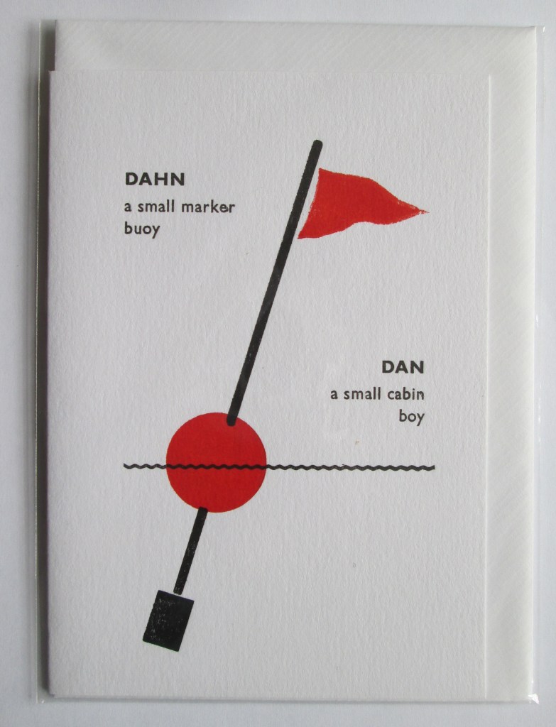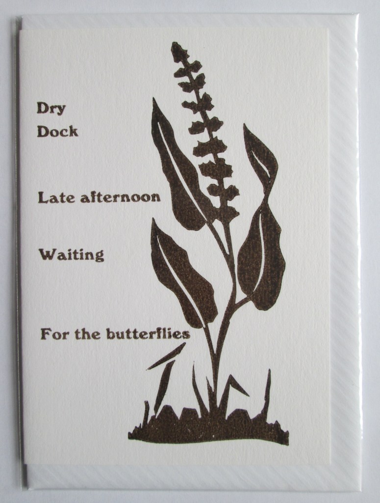 Hand letterpress-printed greeting cards, original or based on Stichill Marigold Press pamphlets. Blank inside.